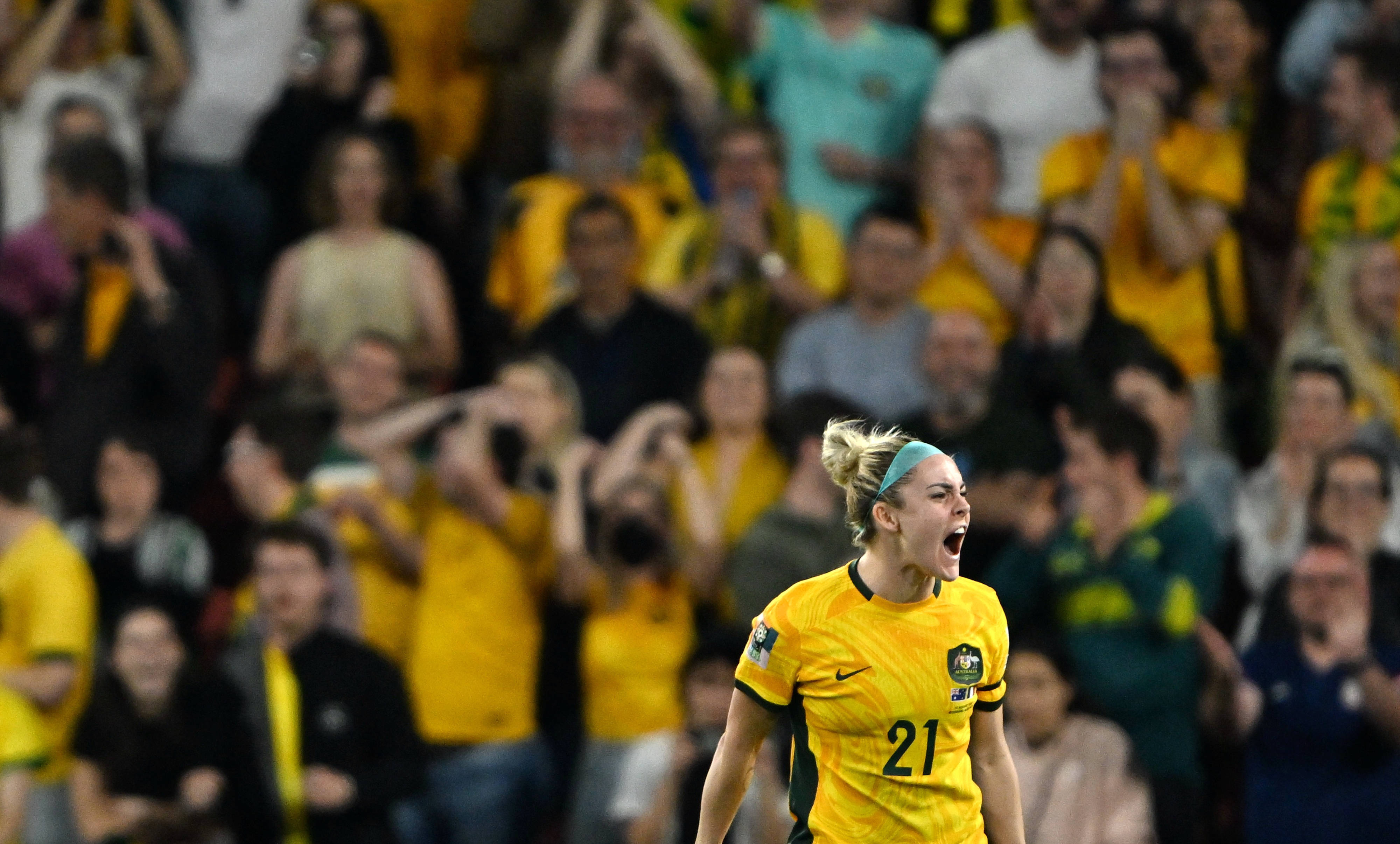 ↑2023年8月12日,女足世界杯四分之一决赛,澳大利亚队球员卡彭特在点球大战中庆祝罚入点球。新华社记者 李一博 摄亚洲女足球队中